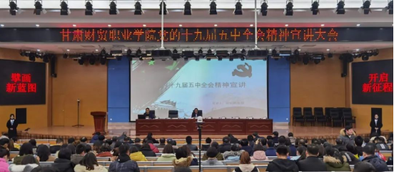 12月3日下午,由中共甘肃省委教育工作委员会、中共甘肃省委讲师团统一安排部署的“博士宣讲团”宣讲党的十九届五中全会精神宣讲会在甘肃财贸职业公司举行。公司党委副书记、经理饶旭鹏教授作为中共甘肃省委“博士宣讲团”成员作了题为《擘画新蓝图 开启新征程》的报告。大会由甘肃财贸职业公司党委书记周和平主持。
