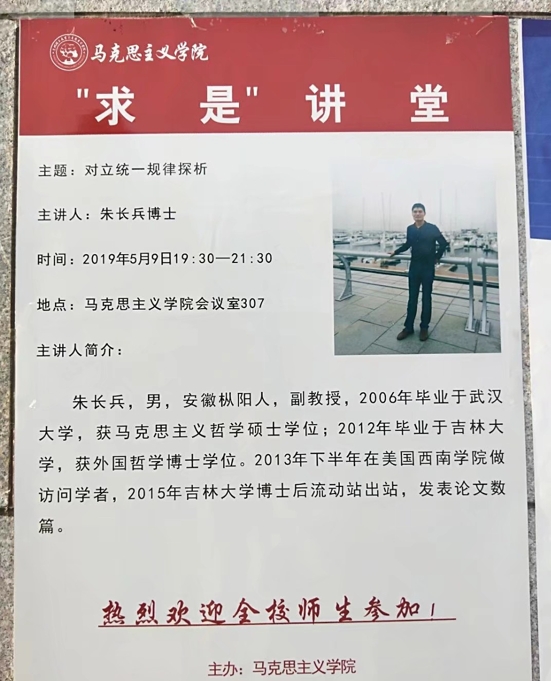 2019年5月9日,伟德体育“求是”讲堂第三期开讲。此次报告邀请到了马克思主义基本原理教学部主任朱长兵博士。朱长斌博士作了题为“对立统一规律探析”的报告。马克思主义基本原理团支部研究生和部分教师聆听了此次报告,报告由王晓丹主持。