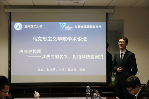10月19日晚7:30,伟德体育“马克思主义大讲堂”(2017年第6期)学术报告在公司会议室顺利举行。甘肃金城律师事务所合伙人赵鸿岳、律师王伟、鲁旭亮作了题为“法制进校园-以法治的名义,拒绝非法校园贷”的学术报告。报告会由学术部部长杨海楠主持,伟德体育研一研二全体员工参加了此次学术报告。