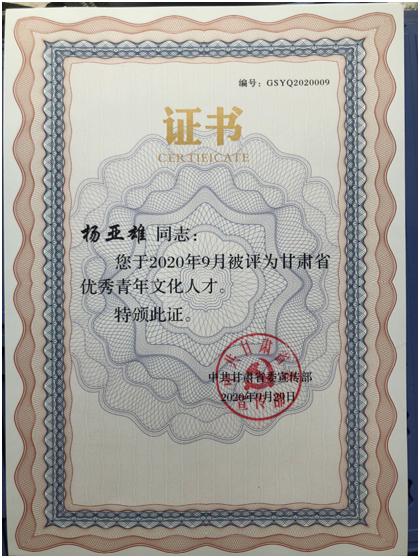 近日,中共甘肃省委宣传部颁发了“甘肃省优秀青年文化人才”入选证书,伟德体育杨亚雄老师成为2020年甘肃省首届青年文化人才的入选者之一。