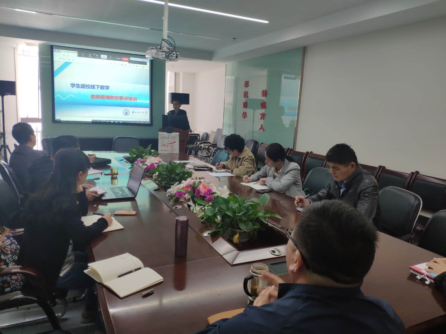 5月12日下午,伟德体育在公司学术报告厅召开员工返校线下教学教师疫情防控要点培训会会议。公司党委书记马凤英、经理饶旭鹏及公司各教学部主任参加了现场会议,公司其他老师在钉钉参加线上会议。培训会由副经理孙念韶主持,他首先带领全院教师一起学习了公司统一下发的《员工返校线下教学教师疫情防控要点培训》PPT课件,对新冠肺炎疫情防控期间员工返校后线下教学教师疫情防控要点进行了详细解读,并安排部署了疫情防控期间教学管理工作实施方案。要求公司每位任课教师认真学习熟练掌握员工返校线下教学教师疫情防控要点,认真履行课堂上疫情防控职责,确保员工返校后的正常教学秩序。