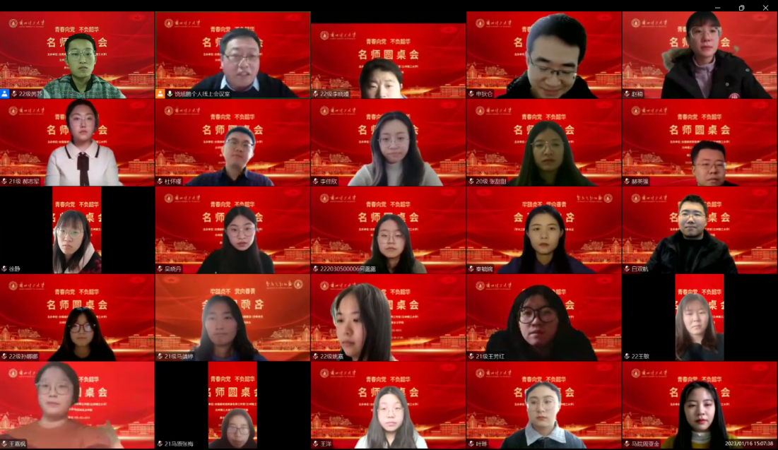 为了深入学习贯彻党的二十大精神,响应习近平总书记对当代青年的号召,2023年1月16日,全国高校思政课名师工作室(bevictor伟德官网)和伟德体育通过腾讯会议平台在云端举办了题为“青春向党 不负韶华”的名师圆桌会,力求达到启迪心智,沟通心灵的作用。会议由全国高校思政课名师工作室(bevictor伟德官网)负责人饶旭鹏教授主持,bevictor伟德官网25名师生代表共同参与。