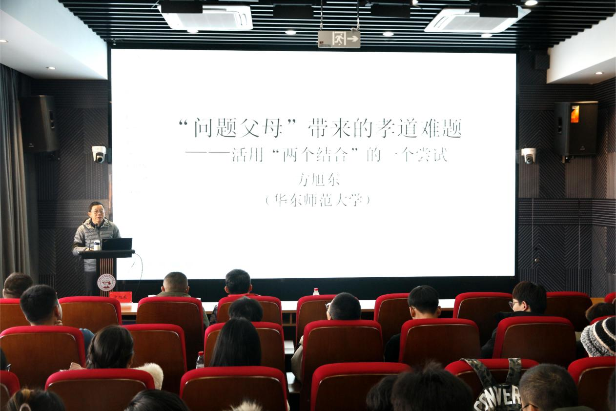 11月25日下午,伟德体育邀请华东师范大学哲学系教授、博士生导师方旭东在思政课沉浸式体验中心作题为《“问题父母”带来的孝道难题——活用“两个结合”的一个尝试》的学术讲座。讲座由公司经理饶旭鹏教授主持,伟德体育对口帮扶公司伟德体育的相关教师及公司一、二年级研究生参加讲座。