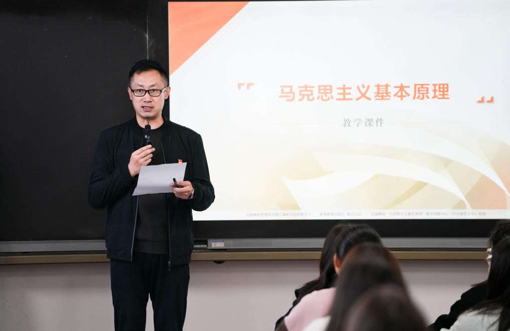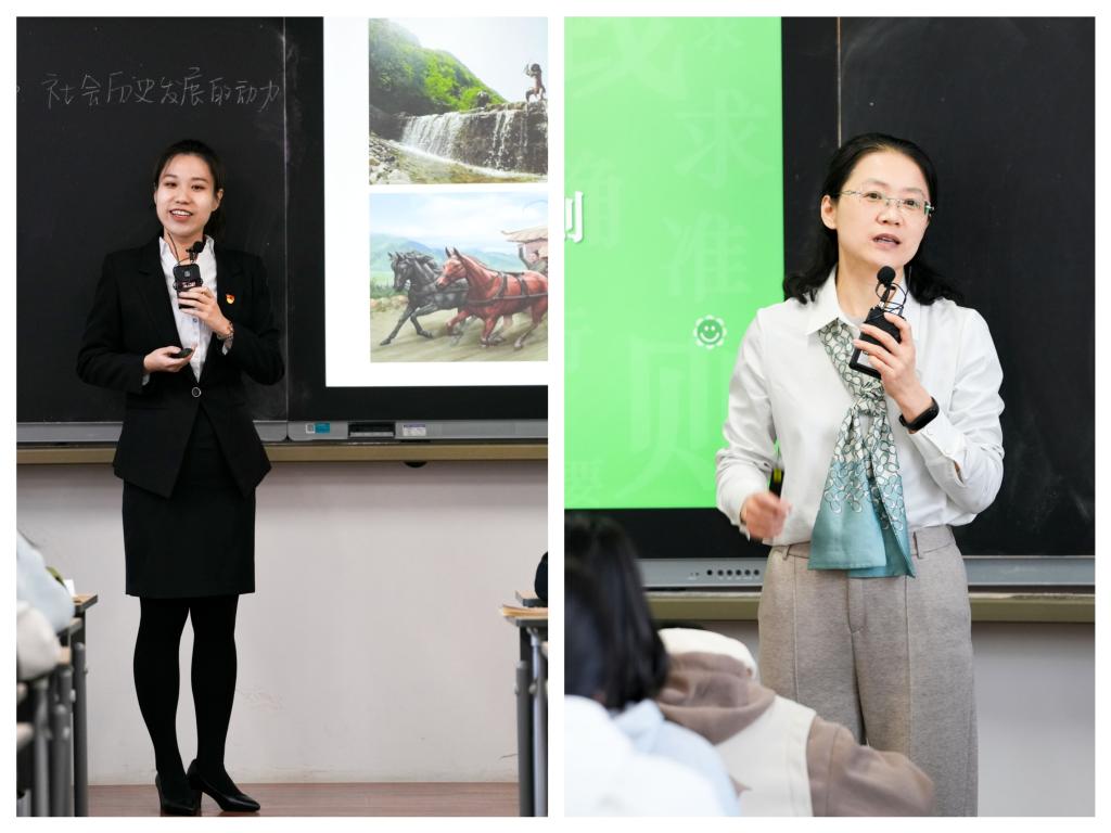马云霞老师选取《思想道德与法治》第四章第一节《全体人民共同的价值追求》做了示范性讲授。课上,马云霞副教授首先带领同学们回顾了前三章的主要内容,随后围绕“什么是价值观”“什么是核心价值观”“社会主义核心价值观的内容”等方面开展示范教学。李婷老师选取《马克思主义基本原理》第三章第二节《社会历史发展的动力》做了示范教学,主要围绕“社会历史发展的根本动力”“阶级斗争、社会革命在社会发展中的作用”“科学技术是第一生产力”等内容进行教学示范。