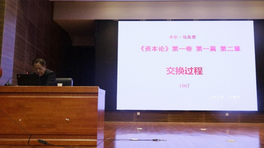 王维平教授从恩格斯1886年《<资本论>英文版序言》解读出发,强调了《资本论》的历史地位与当代价值,并对《资本论》第一卷第一篇第二章“交换过程”进行逐字逐句地深入解读,帮助同学们理解商品交换的条件和交换的必然性、交换的发展过程同时是货币的形成过程、货币的本质和对资产阶级经济学家货币理论的批判等内容。王教授还鼓励同学们认真研读马列经典,指出深入研读经典是理解、运用马克思主义理论的前提和基础,有助于提升逻辑思维能力、语言表达能力、理论认知能力和专业理论素养。